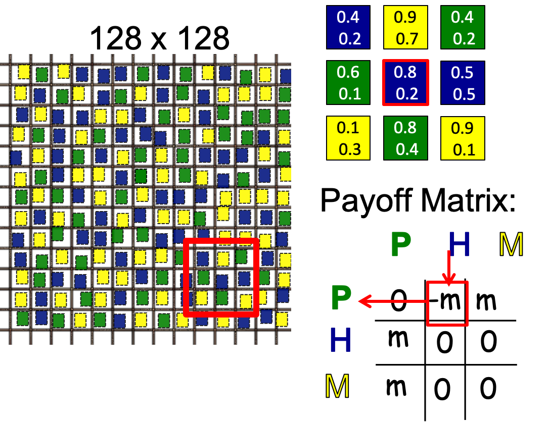 A payoff matrix is filled out based on the interacting organisms and fitness is calculated by averaging all payoffs.