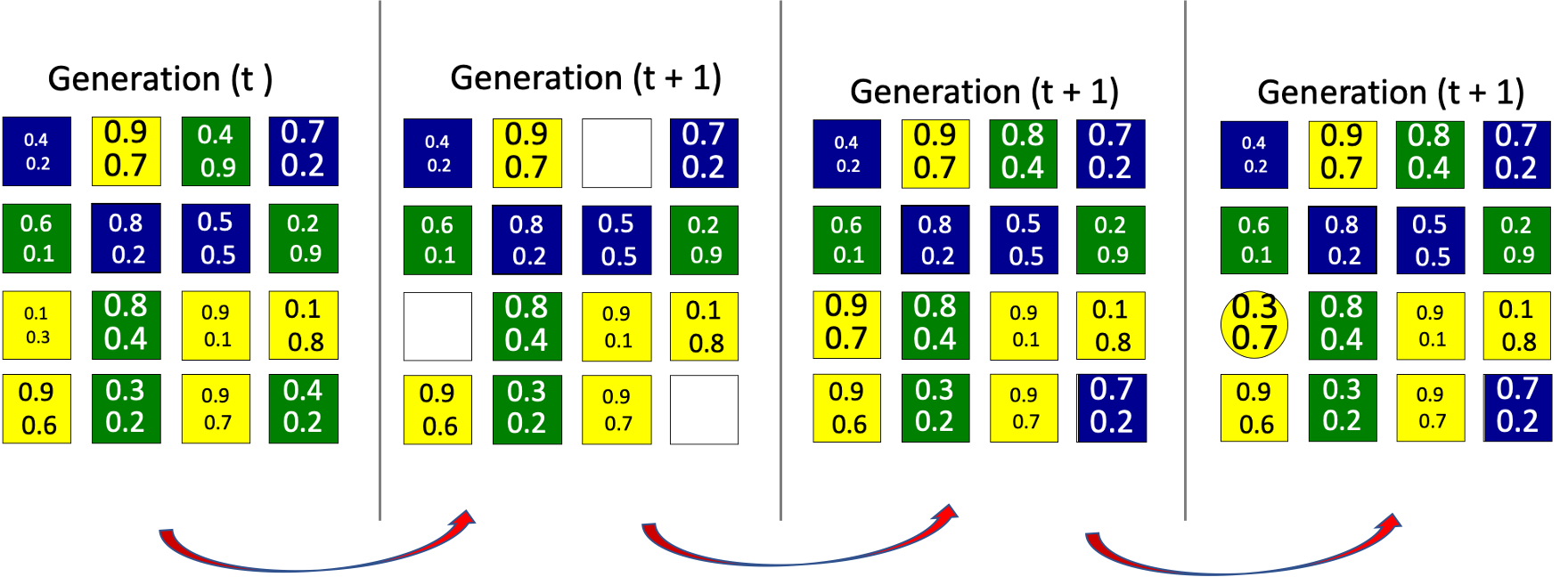 Each organism has a genome that consists of 2 genes that is set as a 2D vector, G = (X,Y) that acts as a single trait.