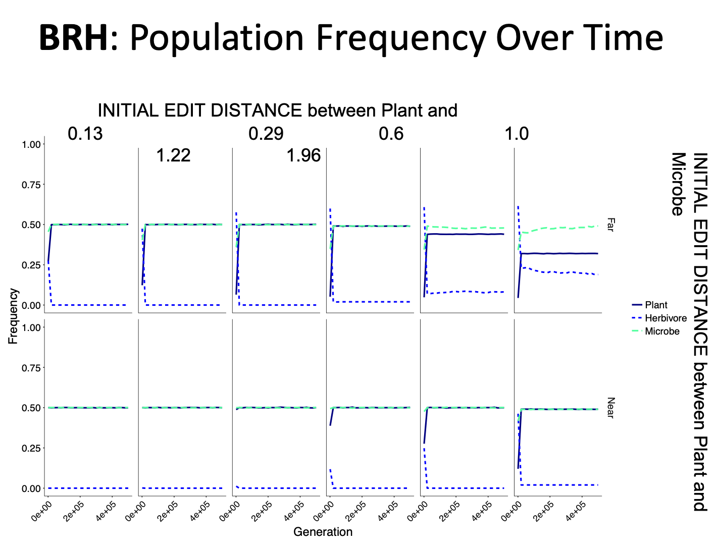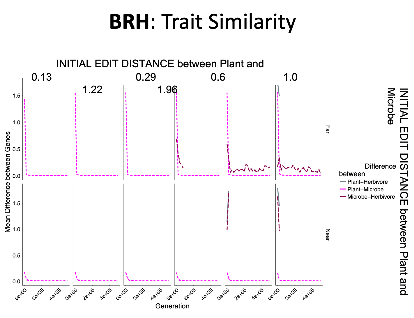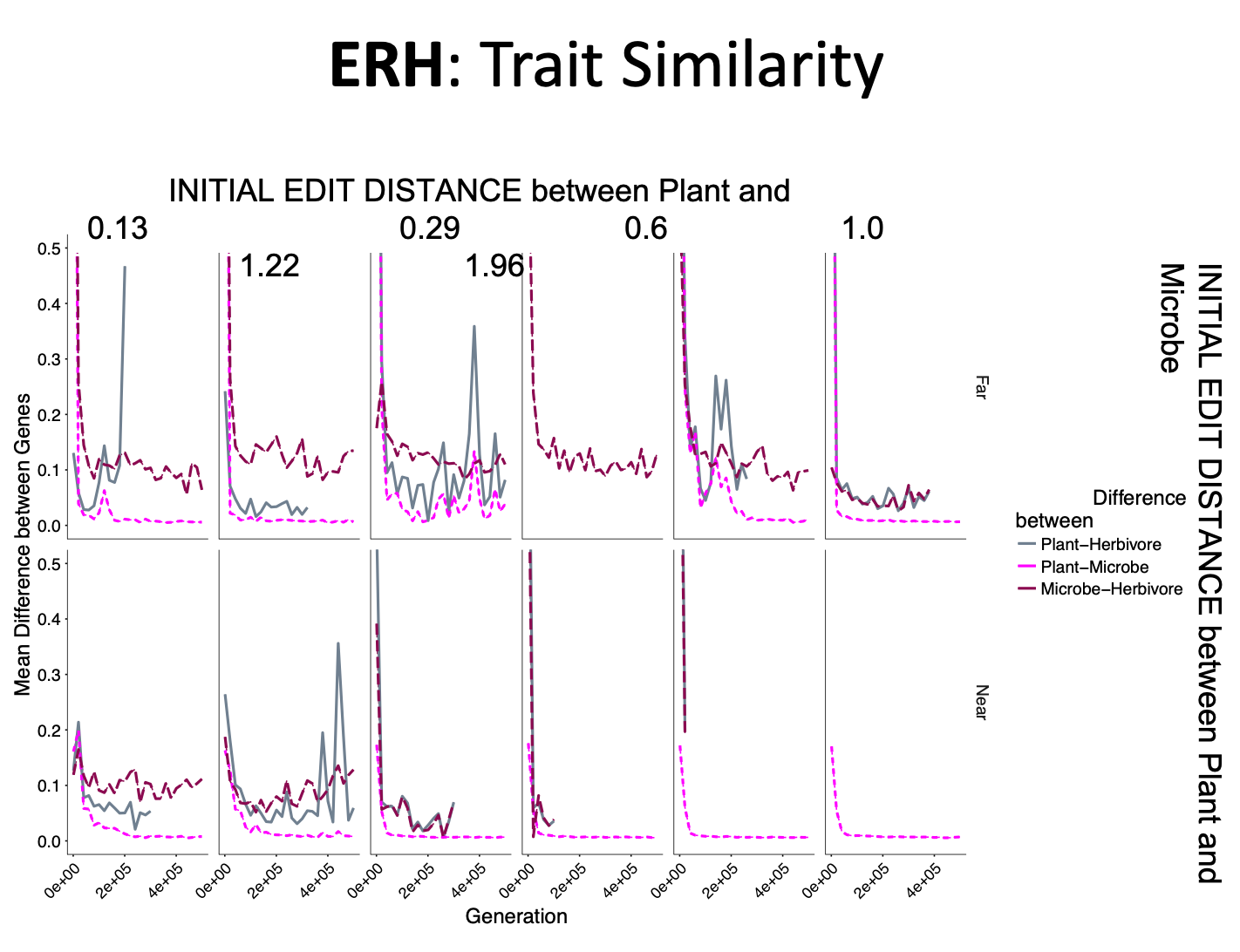 For each hypothesis we varied the trait similarity between plants and herbivores (6 different values spanning trait space) and between plants and microbes (2 values, near and far)
