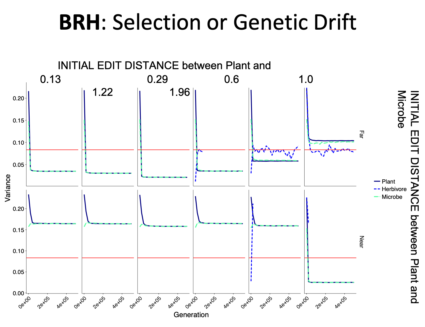 The variance of the genetically-determined trait in our system can determine whether the organisms are under selection or if changes in the traits are due to genetic drift. When the variance is at the red line (variance = 1/12), then changes in trait values are due to genetic drift. Otherwise, the organisms are under selection.