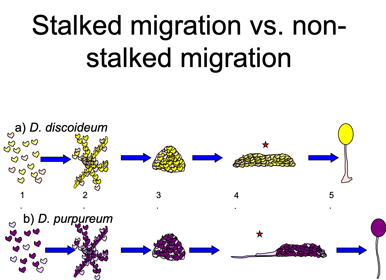 Cells that remain in the mixed aggregates form heterospecific slugs that allow them to traverse greater distances over smaller conspecific slugs, which is advantageous, but are at a fitness disadvantage compared to conspecific slugs of the same size (Jack et al 2008 ).